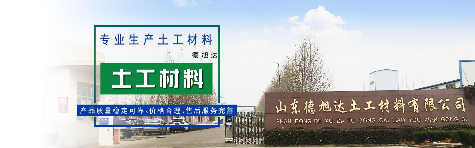山東德旭達土工材料有限公司是目前規模較大,品種較全的土工合成材料專業生產企業,是全國土工合成材料生產基地重點企業之一,注冊資本為5070萬元,占地面積120畝,現有員工100余人,其中各類專業技術人員40多人。 地理位置優越,交通十分便捷。山東德旭達土工材料有限公司位于西漢大文學家東方朔故里,魯西北著名歷史名城—德州 市陵城經濟開發區。京滬高速鐵路依縣而過,京福高速公路、德煙鐵路、京滬鐵...【了解更多】